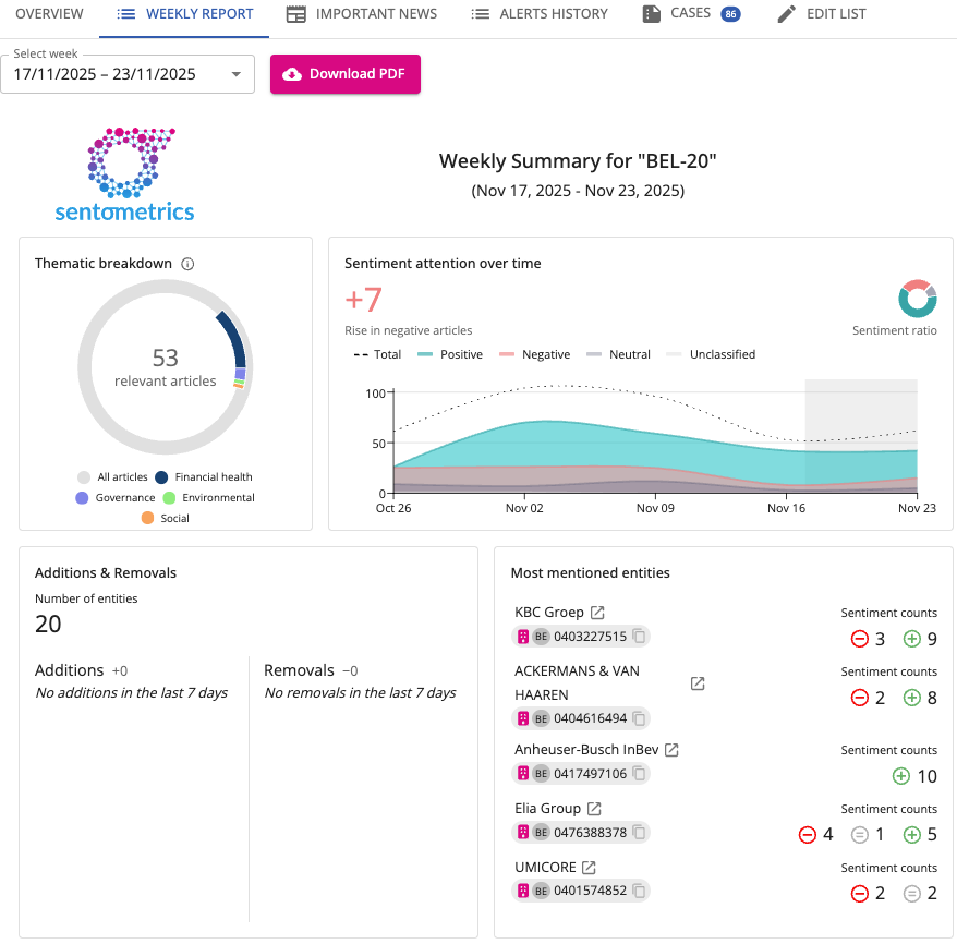 Stay informed with Weekly watchlist reports, delivered to our inbox or available on demand. Track emerging risks, new opportunities, and sentiment shifts across your selected companies.