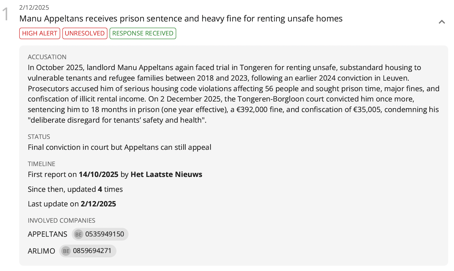 Independent experts verify and structure each case, providing a clear summary, involved entities, a timeline of relevant news articles, and defined severity and status indicators. Where no public response exists, the company’s position is actively sought and documented, while unresolved conduct risks continue to be reflected in fraud risk severity.