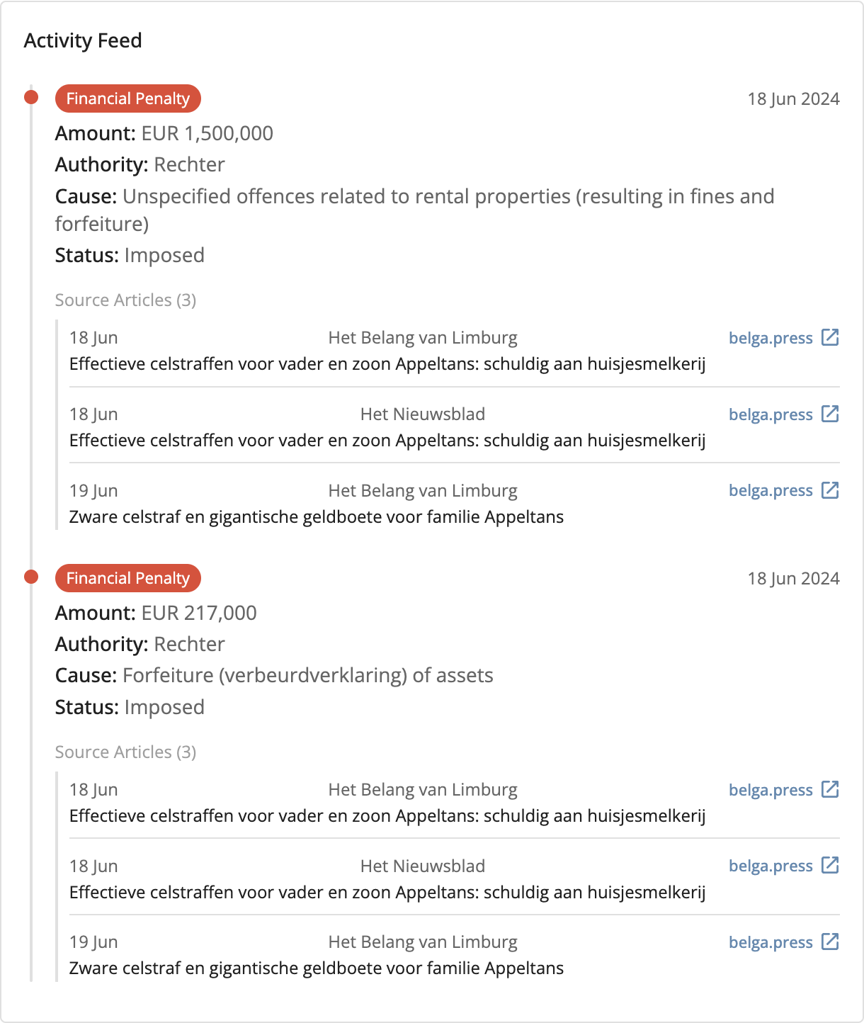 We identify fraud events linked to companies and individuals, providing insight into proven or alleged misconduct. In parallel, we extract court cases and financial penalties to capture legal and regulatory actions that act as predictive signals of elevated fraud risk. Together, these verified events deliver timely, structured visibility into both historical fraud exposure and emerging fraud risk drivers.