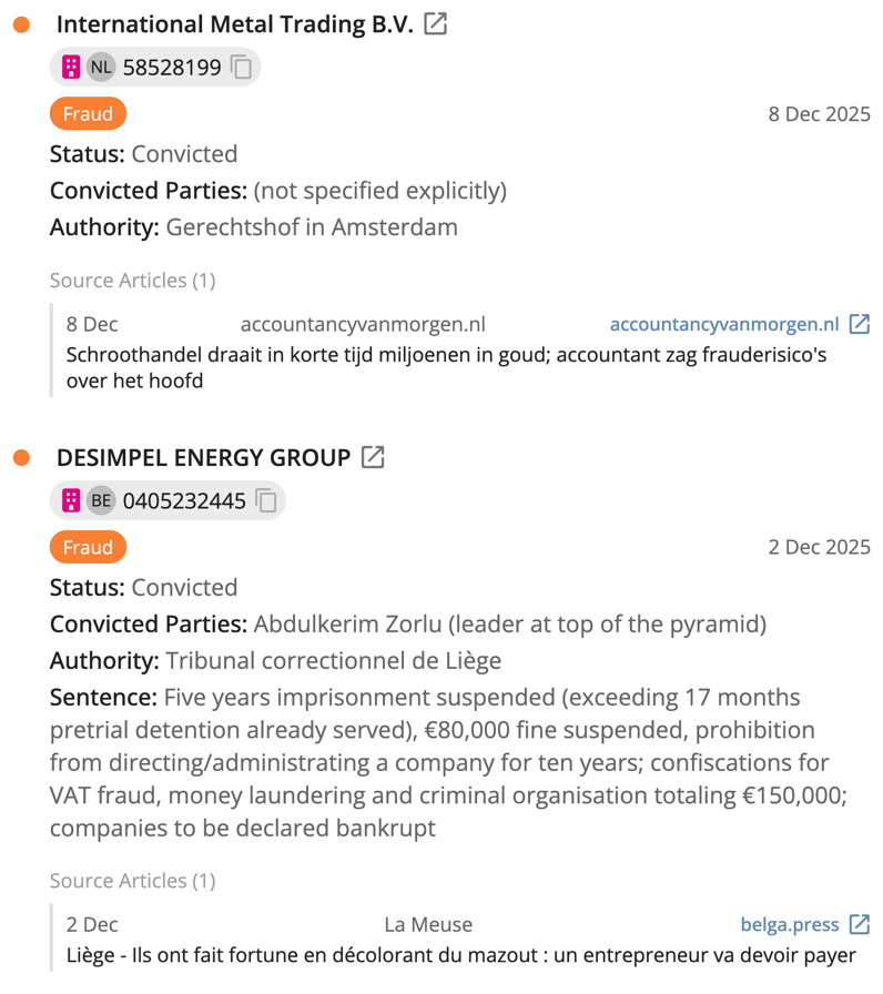 Our insights are primarily driven by large-scale news scanning, combined with network analysis that maps connections to exposed companies. All fraud-related signals are consolidated into a single, structured fraud risk report for every company in Belgium.
