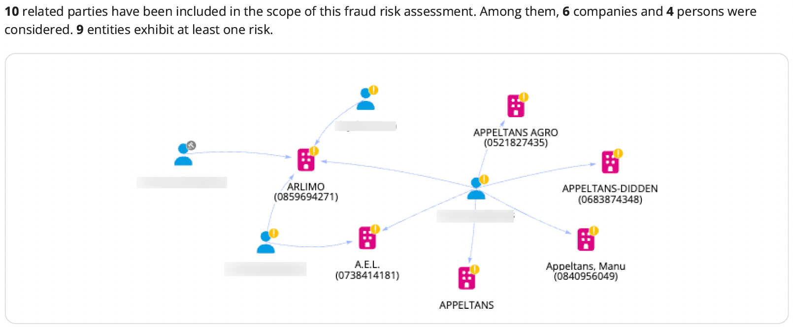 Clear risk flags highlight companies and persons linked to fraud risk notifications, helping teams quickly prioritize investigations and understand indirect exposure.